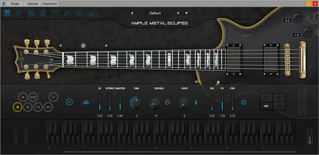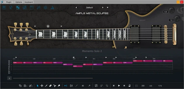 Ample Guitar E is a virtual electric guitar which is based on samples of a ESP Eclipse. The library has over 4 GB of samples, all in 44.1 kHz and 24 bit recording quality. Furthermore Ample Guitar E offers all common playing varieties such as strumming, fingerpicking and much more. Another feature is the integrated tab player that can play all popular formats of Tabs. Built-in AMP system, including 5 classic AMP models: Metal Treble (modeled on Mesa Boogie Triple), Lead 800 (modeled on Marshall JCM800), Jazz 120 (modeled on Roland JC120), 65 Twang (modeled on Fender 65 Twin Reverb) and 57 Delight (modeled on Fender 57 Deluxe). Multiple selection and operation, undo and redo etc. multiple MIDI tools, including fixed velocity, length legato and restrict, select, move, draw, erase, split, glue etc. The Tab Player can load and play several prevalent guitar tablature file formats. Users can load, display and playback any specific track inside a tablature file. When used in DAWs, the Tab Player also allows users to export the tablature as an audio file.