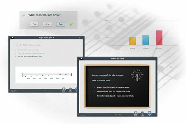 eMedia Music Theory Tutor shows you when you are playing or singing the correct pitches in a lesson and lets you see your progress. Many lessons let you respond by humming, singing, or playing your instrument into the computer’s microphone. Tap rhythms, sing back melodies, guess intervals, and much more! Gain confidence as you pass each music theory quiz at the end of a subject and ace tests at the end of every grade level completion. Learn how to read music, basic chord theory, scale theory, and the building blocks of music. Learn music theory to hear melodies, scales, intervals, chords, and rhythms “in your head” so you can compose without an instrument and learn songs faster.