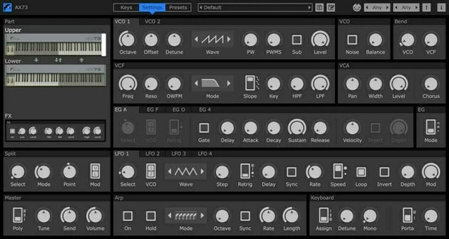 The best elements from other synths in the AX range have been distilled into a feature-rich reinterpretation of the AX73. Notable examples include: extra chorus settings and the arpeggiator from the AX60, a second VCO and sub-oscillator from the AX80, and an extended VCO octave range down to 32’, as seen in both the AX60 and 80.